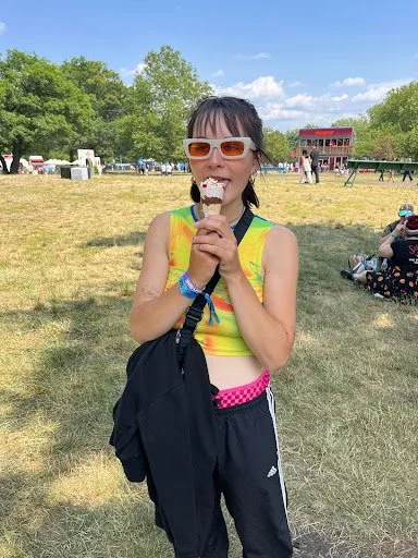 I am wearing my bright pink parade undies, adidas pants I thrifted off my roommate, and this weird rainbow filtered shirt I got at Beacon’s, with my trusty orange sunglasses I got at a vintage store in Philly.