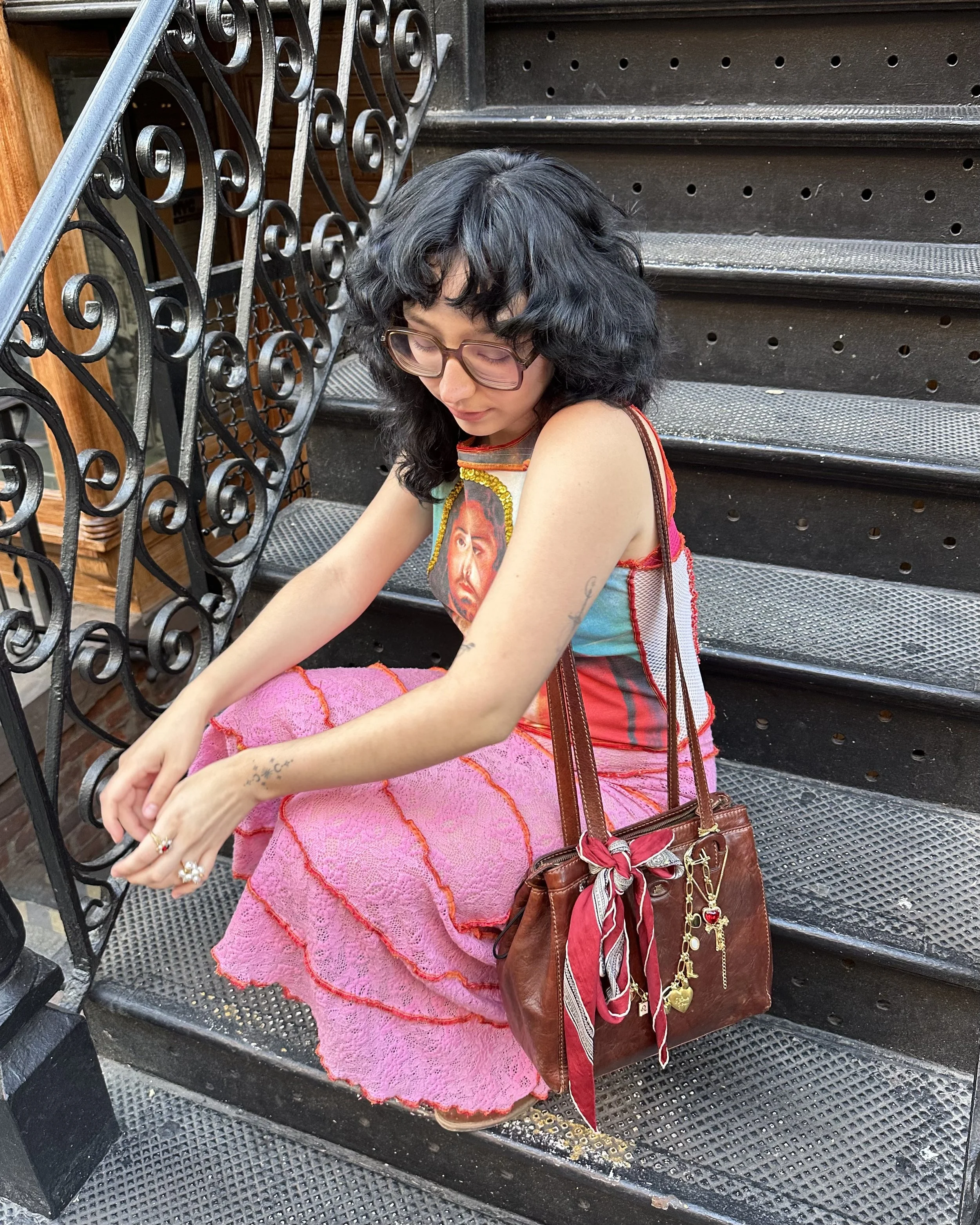 I’ve been experimenting with incorporating more masculine pieces into my wardrobe, which includes this suit set by Emma Mulholland on Holiday. As a CEO, I couldn’t help but imagine this is the exact type of thing I’d wear into our future Sustainable Baddie office, though for now, I’ll proudly strut around town and my home office like this. I wore it with this Orseund Iris top that I rented from Hauteline, my Prev boots made from apple leather, and my vintage Anna Sui purse, which I got from Poorly Curated. I embellished my jacket with a Marimekko pin and brooch from a stoop sale, and my gold/pearl earrings were borrowed from Keane. Everything else is secondhand.