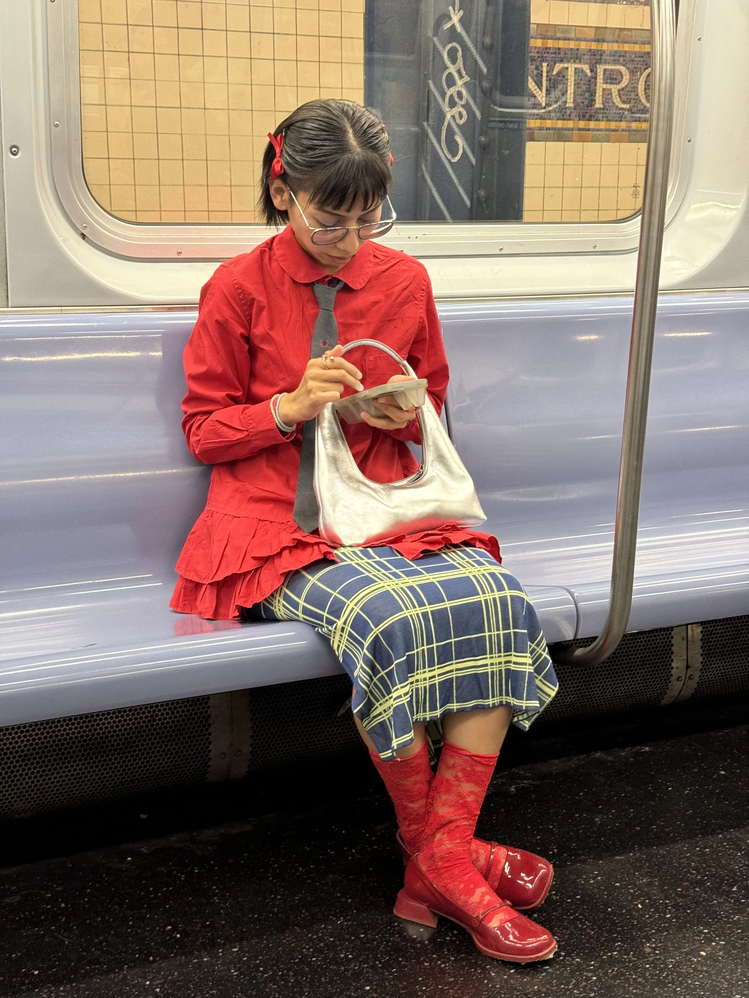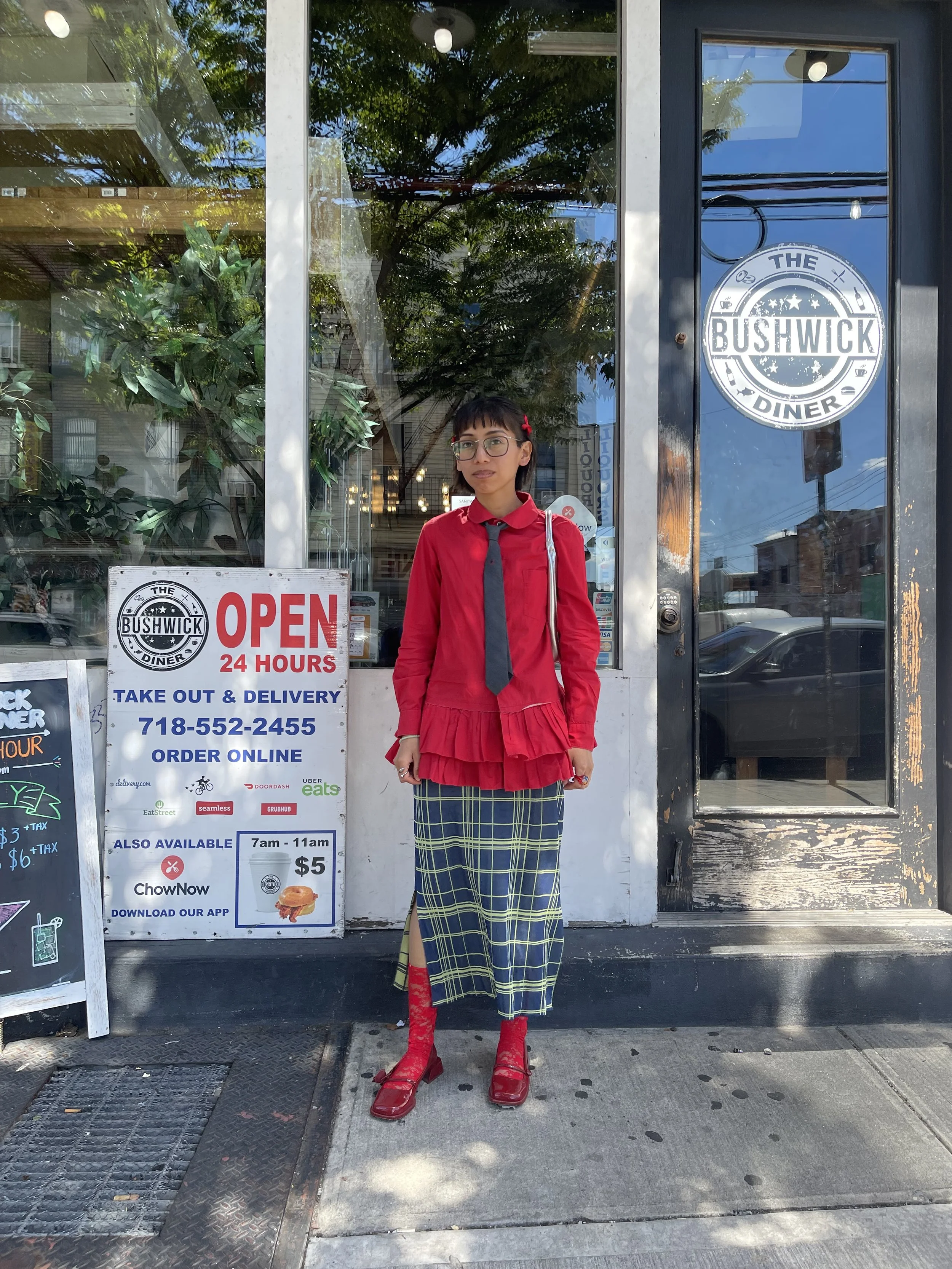 I wore a red Comme des Garcons shirt from The Real Real laid over a PH5 dress from The Real Real, a thrifted tie and ring, red bow clips from The Room Shop, Marge Sherwood bag from the SSENSE sale, and my ShuShu/Tong x Charles & Kieth collab red Mary Jane shoes.