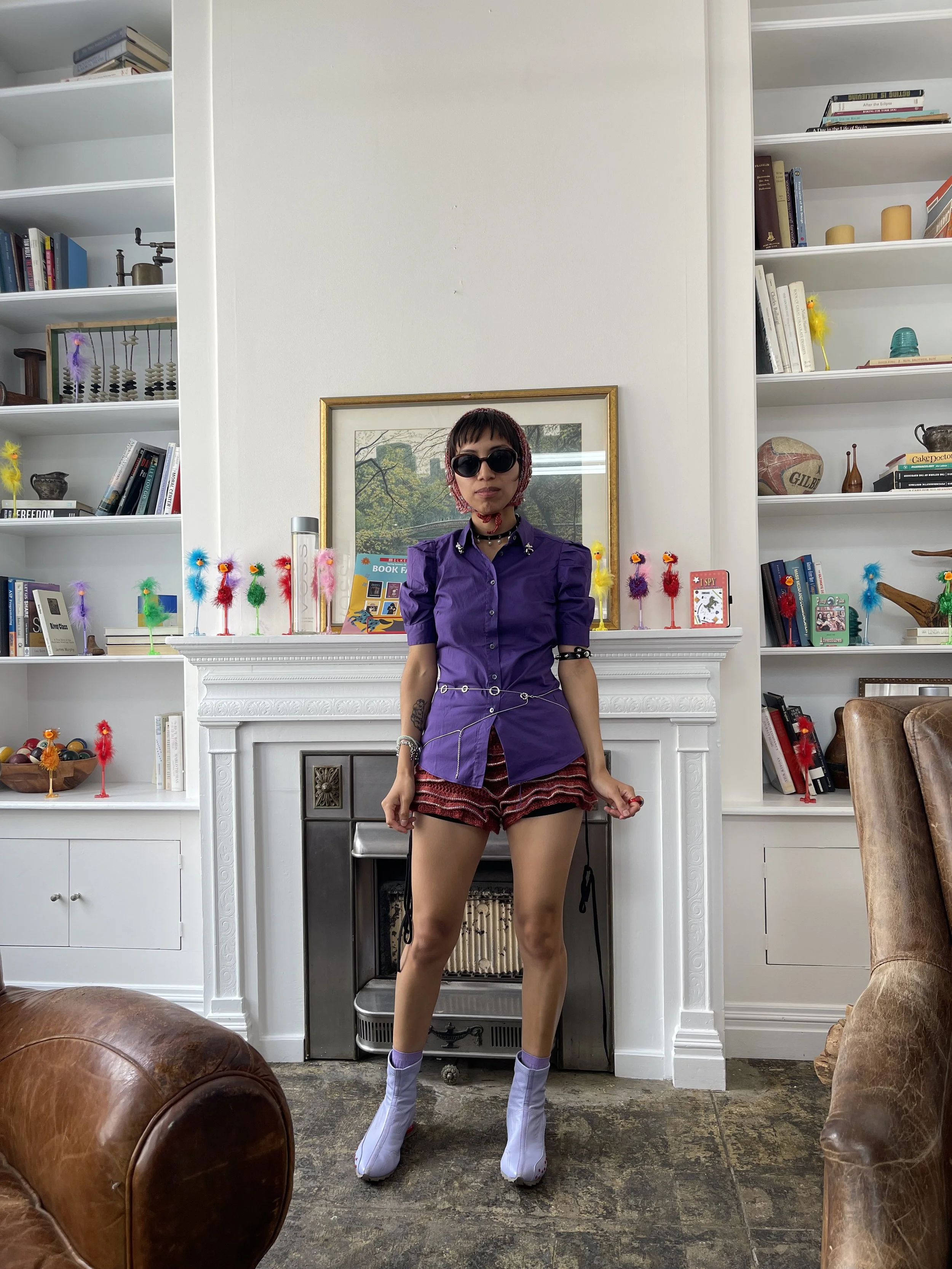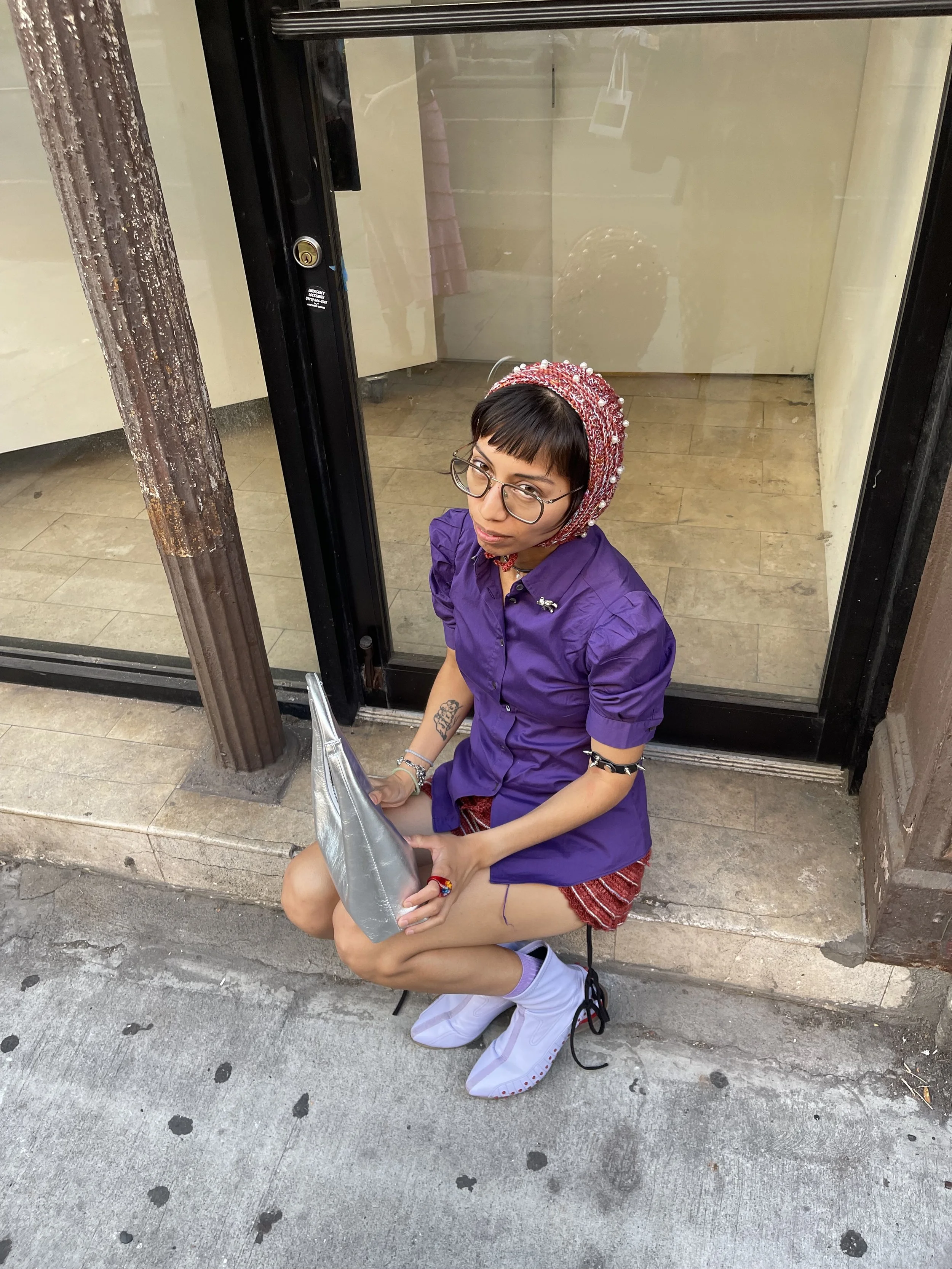 I wore a purple Miu Miu dress shirt from The Real Real, red bloomers and balaclava I made from thrifted yarn, Kiko Kostadinov shoes from Vestiaire, a choker from Justine Clenquet, and a thrifted belt chain, ring, and armband.